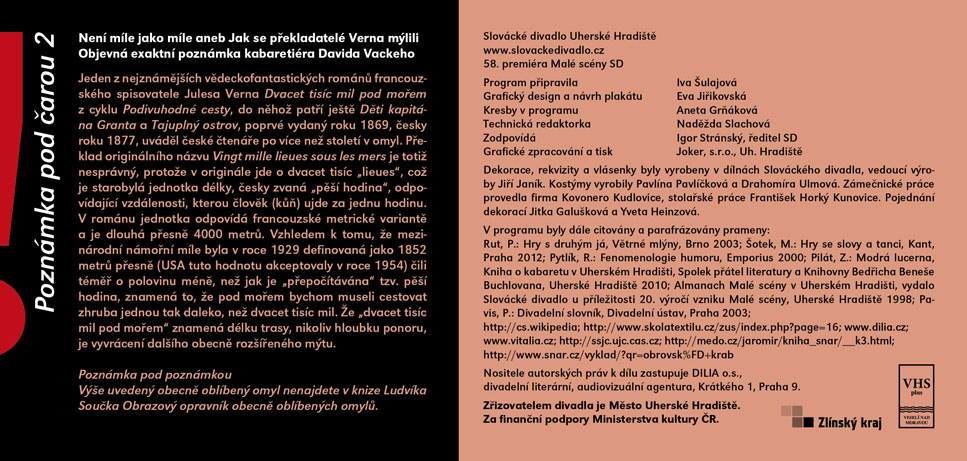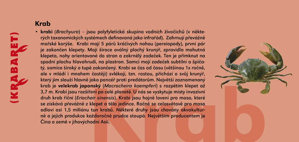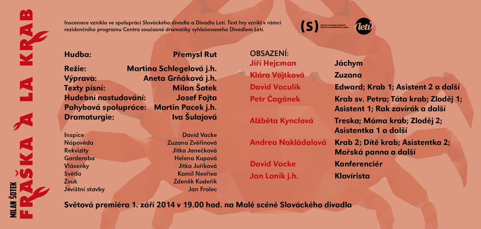 Francouzské slovo farce (fraška) označuje nejen komediální žánr, ale také nádivku. O tom, jaká bude hlavní přísada naší frašky, vás její název jistě nenechá dlouho pochybovat. Vztah Zuzany a Jáchyma, ústřední dvojice hry, už delší dobu neklape. Oba – ona logopedka, on nohejbalista – začínají propadat pocitu, že jedinou věcí, která je ještě pojí, je nepříliš vzrušivé hraní „slovního fotbalu“. Když si však ze společné dovolené omylem přivezou kraba, nabírá jejich soužití dosud netušené obrátky. Netrvá dlouho, a krab poprvé promluví… A rázem tu máme bláznivý milostný trojúhelník! Původní krabaret napsal dramaturg Milan Šotek, autor a textař autorského divadla Cabaret Calembour, přímo pro soubor Slováckého divadla s cílem osobitě navázat na tradici kabaretů Přemysla Ruta. Neboť v první řadě půjde o čirou radost ze hry – slovní, pohybové, hudební! Režie se ujme Martina Schlegelová.
