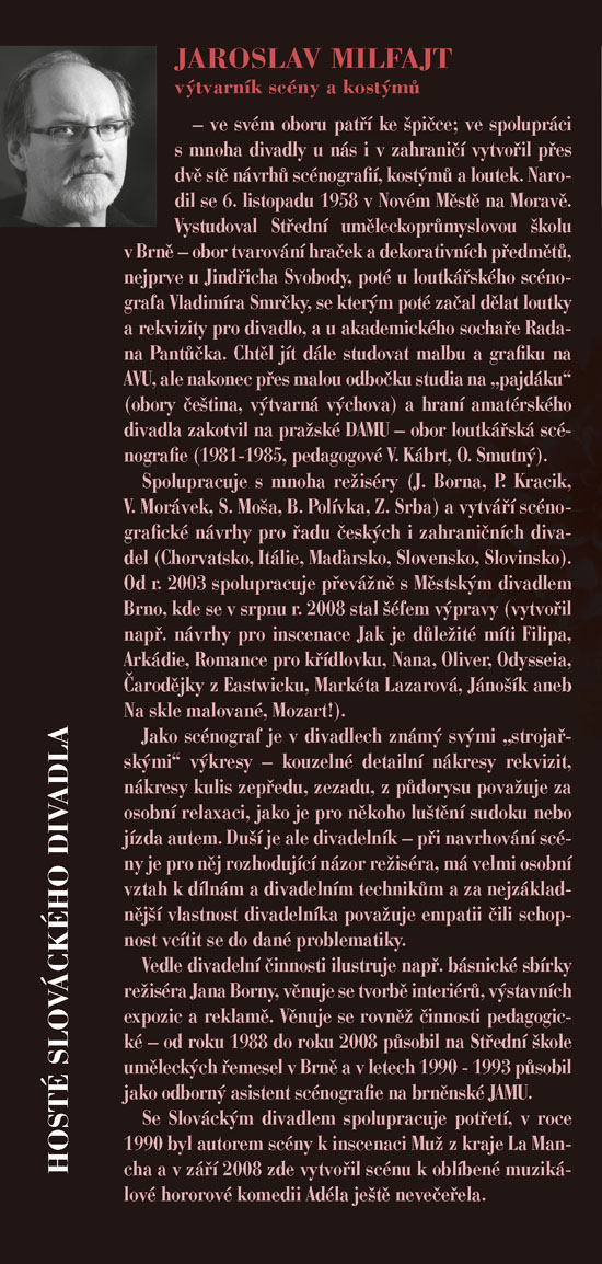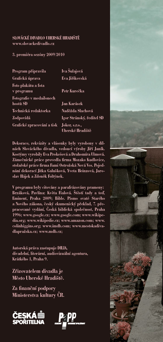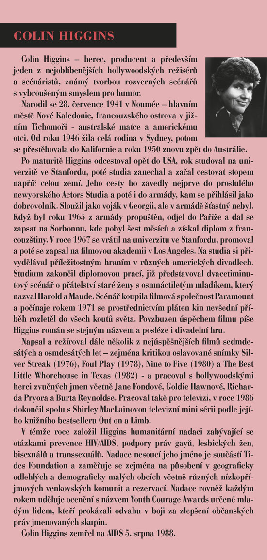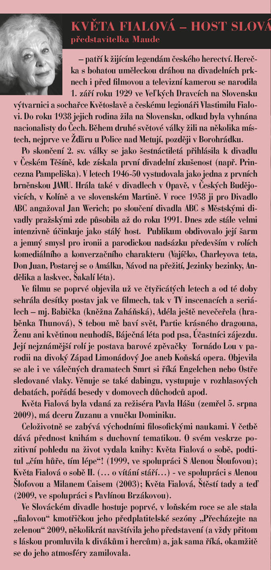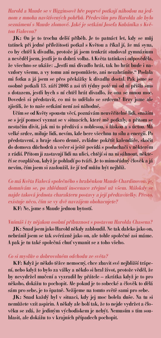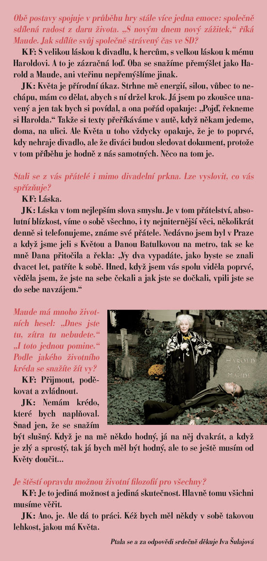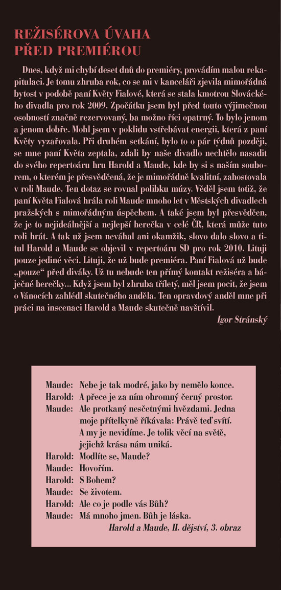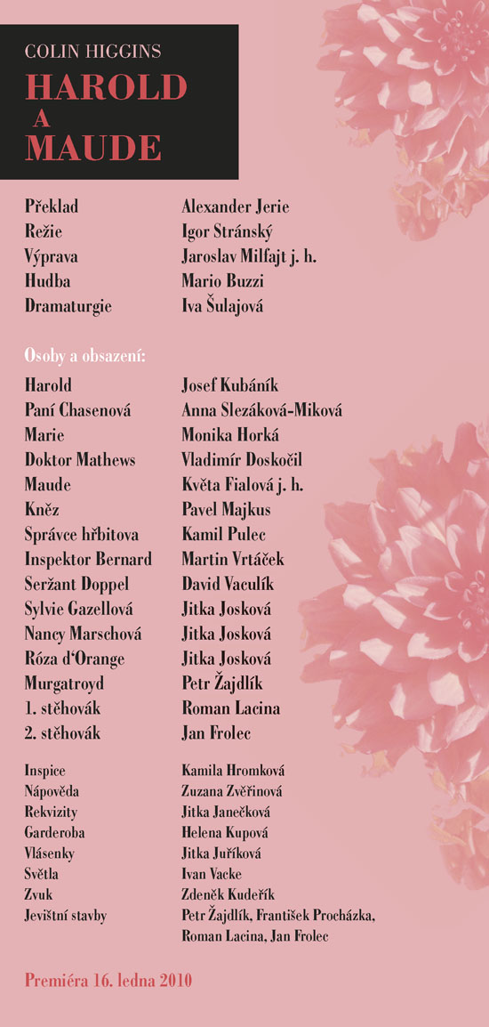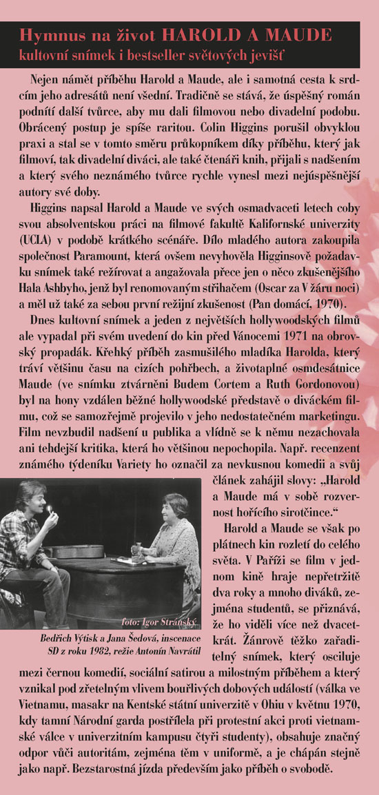 To je životní heslo jedné z titulních postav hry - Mathildy Chardinové, zvané Maude, která vám stejně jako Haroldovi možná zcela změní pohled na svět kolem vás. Harold a Maud se seznámí na pohřbu, oba je totiž pravidelně navštěvují, každý však za jiným účelem. Zatímco on je nenapravitelný pesimista a „sériový sebevrah“, ona je obdařena překypující radostí ze života, vírou, že každý konec je jen začátek něčeho nového, lepšího. Ve společnosti Maude jsme spolu s Haroldem postupně okouzleni plností a hloubkou života, prostřednictvím jejího krásně nekonvenčního pohledu na svět uvěříme, že budeme-li chtít, můžeme opravdu všechno. Příběh bizarní dvojice osmnáctiletého mladíka a osmdesátnice napsal americký herec, režisér a scénárista Colin Higgins původně jako součást své diplomové práce na filmové akademii v Los Angeles. Zprvu pouhý dvacetiminutový scénář byl vzápětí úspěšně zfilmován, a autor námět poté zpracoval jako román a nakonec i jako divadelní hru. Když byla poprvé uvedena v roce 1973 v Paříži v Theatre Recamier, zůstala na repertoáru šest let. Kritikové tuto hru, o níž se dnes dá právem mluvit jako o bestselleru světových jevišť, označili jako „hymnus na život“. Ve SD ji nastuduje režisér Igor Stránský, a v titulní roli Maude uvidíte dámu, jejíž vztah k životu se od toho Maudina téměř neliší – vynikající herečku Květu Fialovou.