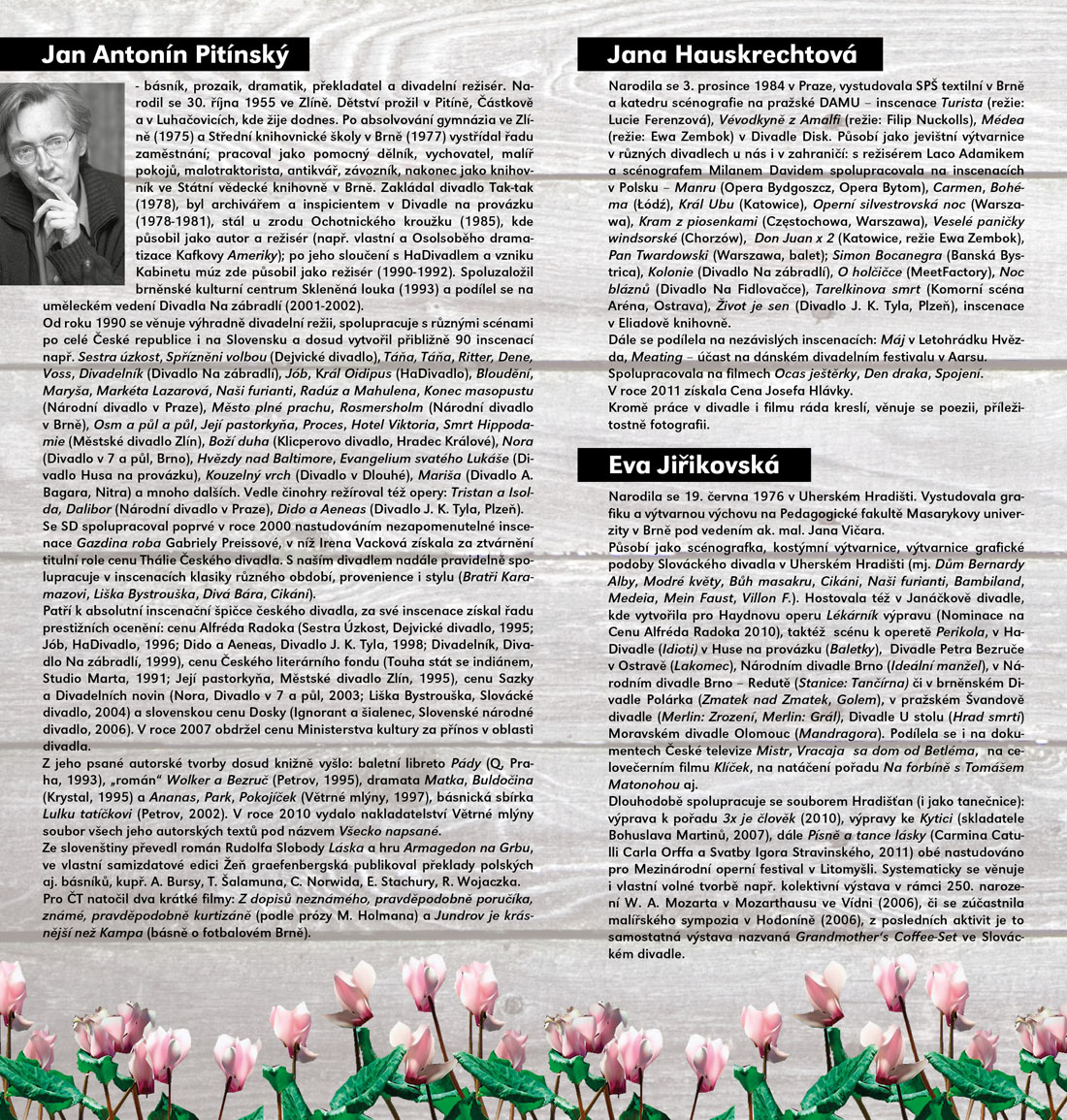 Inscenaci v režii Jana Antonína Pitínského, ve scéně Jany Hauskrechtové, v kostýmech Evy Jiřikovské, s hudbou Tomáše Jeřábka uvedeme ve Slováckém divadle v české premiéře 4. února 2012. Uvidíte v ní Pavla Majkuse,Tomáše Šulaje, Moniku Horkou, Andreu Nakládalovou, Kamila Pulce, Pavlínu Hejcmanovou nebo Irenu Vackovou, Jitku Joskovou, Kláru Vojtkovou, Petra Čagánka, Pavla Hromádku, Vladimíra Doskočila, Jiřího Hejcmana, Zdeňka Trčálka, Jana Horáka.