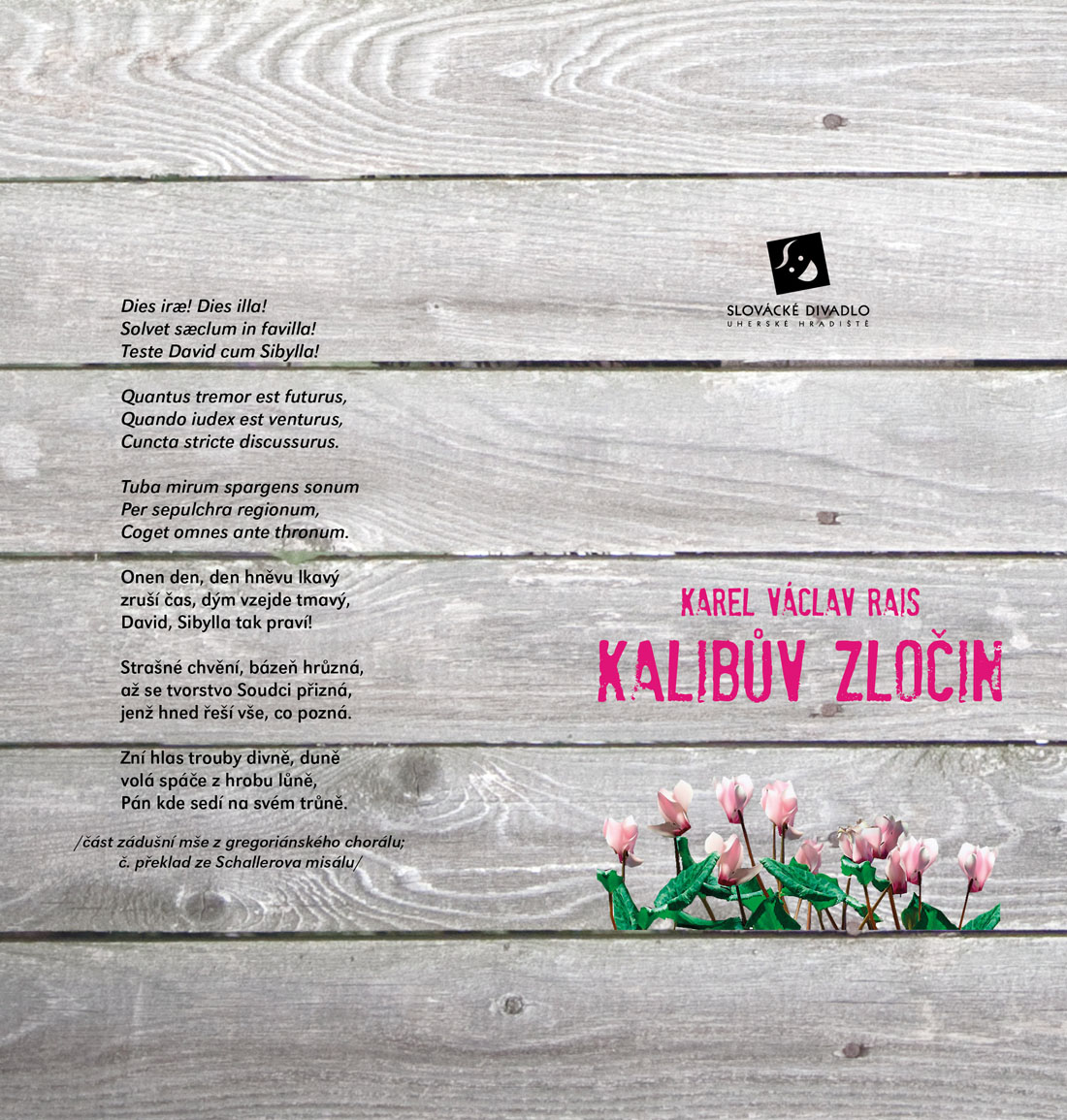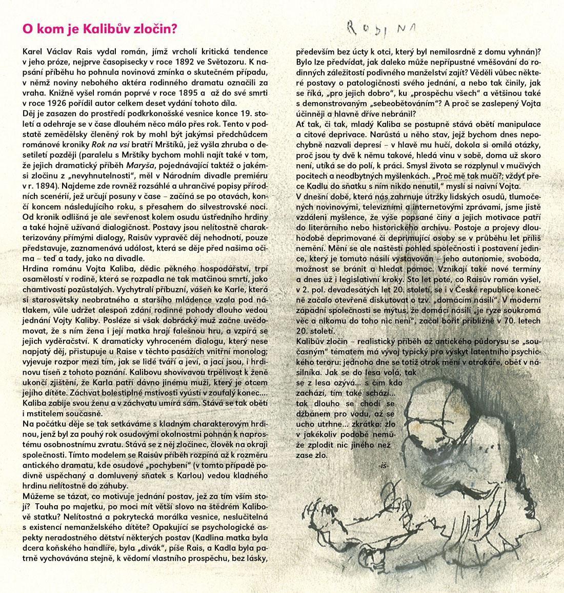 V naší scénické úpravě Kalibova zločinu jsme vyšli z dramatizace Bedřicha Vrbského, který román pro scénu upravil už v roce 1935 (jeho úprava se však nikdy nehrála na profesionální scéně), a přidali některé další motivy Raisovy, Huberta Krejčího ad.