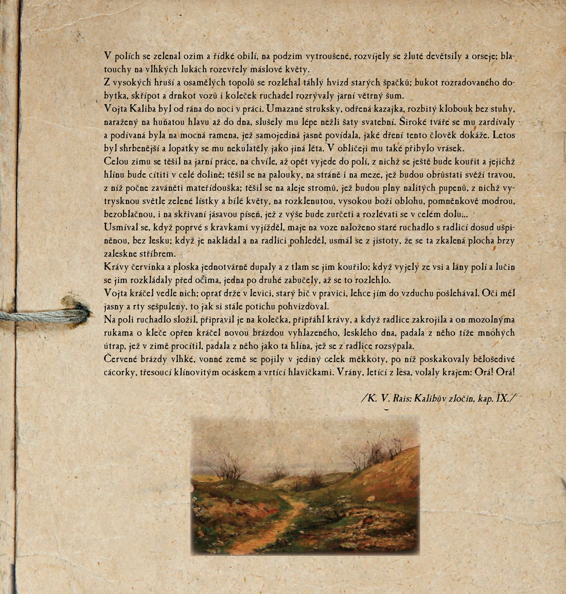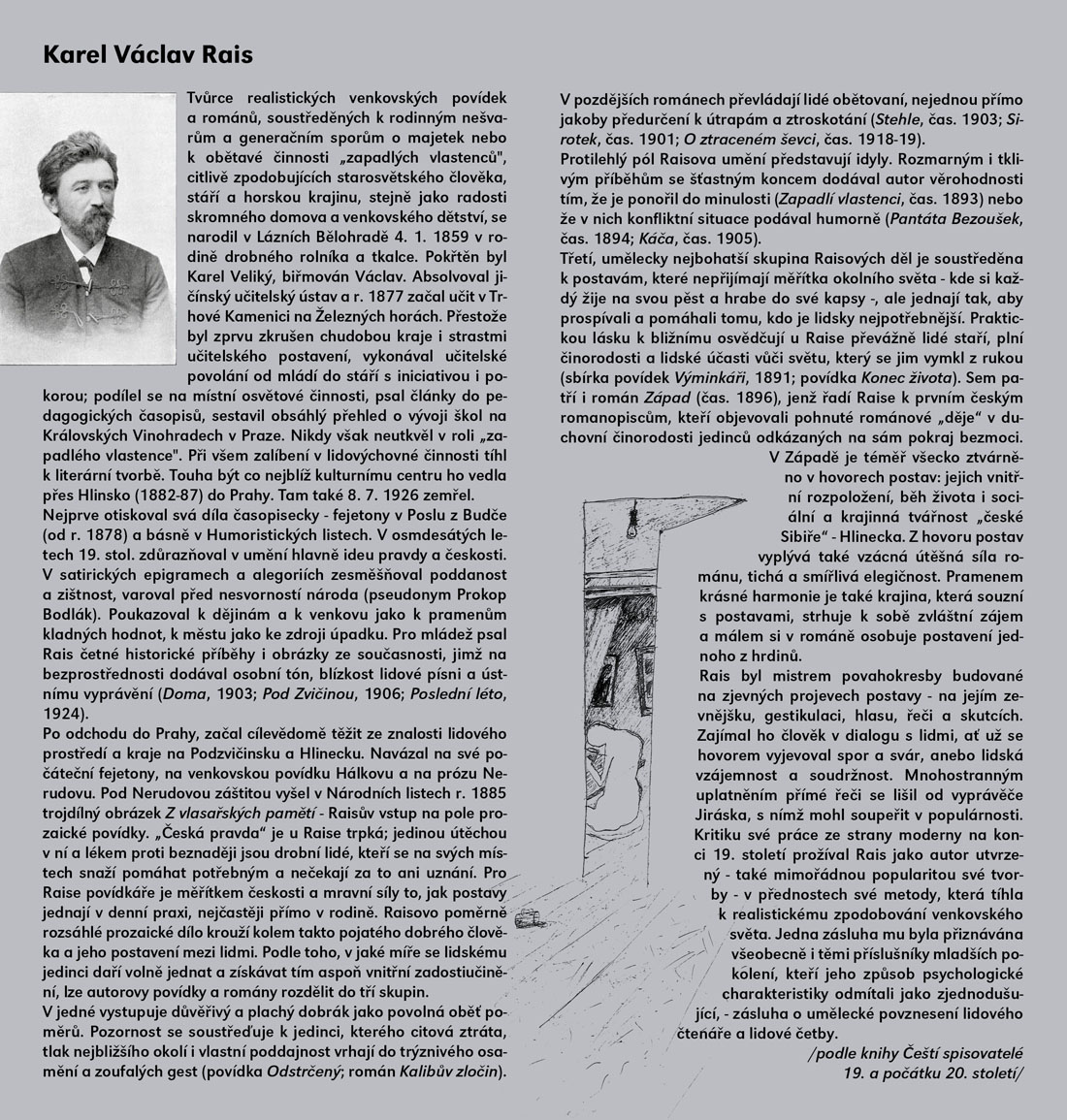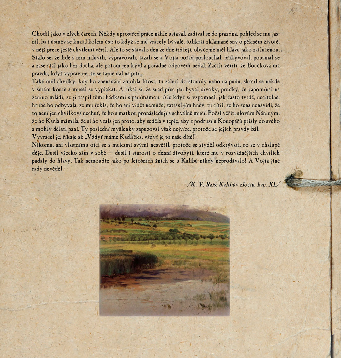 Karel Václav Rais (nar. r. 1859) vydal svůj román Kalibův zločin téměř přesně o sto let dříve - poprvé v roce 1892 ve Světozoru, knižně poprvé v roce 1895. Až do své smrti v roce 1926 pořídil autor deset vydání tohoto díla, jež podle literárních historiků představuje vyvrcholení kritické tendence v Raisově próze. Hovoříme-li o domácím násilí, pak ho v Kalibově zločinu najdeme zpočátku ve skryté takřka latentní formě – v psychickém týrání a v manipulaci, které se však stupňují a které dovedou svou oběť (jak to často u dlouhotrvajícího útlaku bývá) až k zoufalému násilnému činu, jemuž za oběť padne prvotní násilník. Otrok se mění v otrokáře - jak se do lesa volá, tak se z lesa ozývá - s čím kdo zachází, tím také schází - tak dlouho se chodí se džbánem pro vodu, až se ucho utrhne: zkrátka zlo v jakékoliv podobě nemůže zplodit nic jiného než zase zlo. A tak podobně jako např. v případě zločinu Mrštíkových Maryši (která měla mimochodem premiéru v Národním divadle rovněž v roce 1895) chtělo by se za název Kalibův zločin připsat otazník. Karla Václava Raise přiměla k napsání příběhu skutečná událost, zejména pak novinová zpráva, označující aktéra nešťastného činu za vraha.