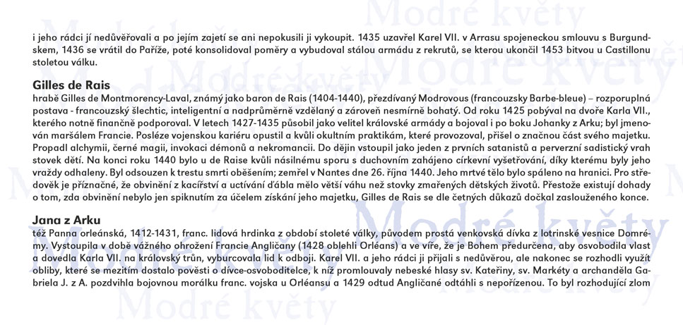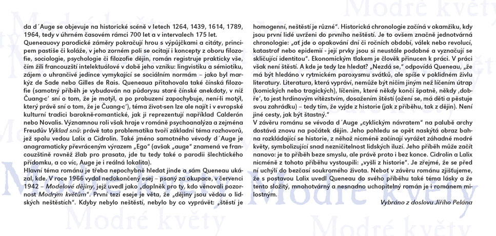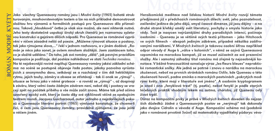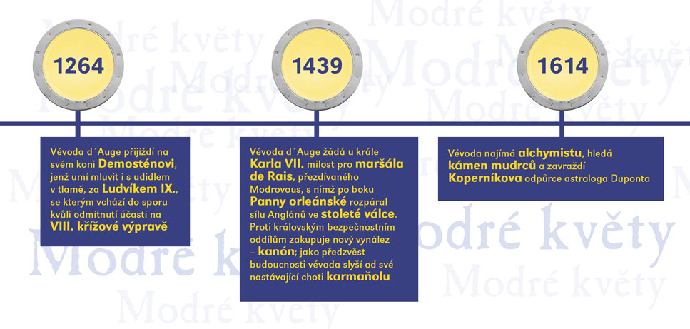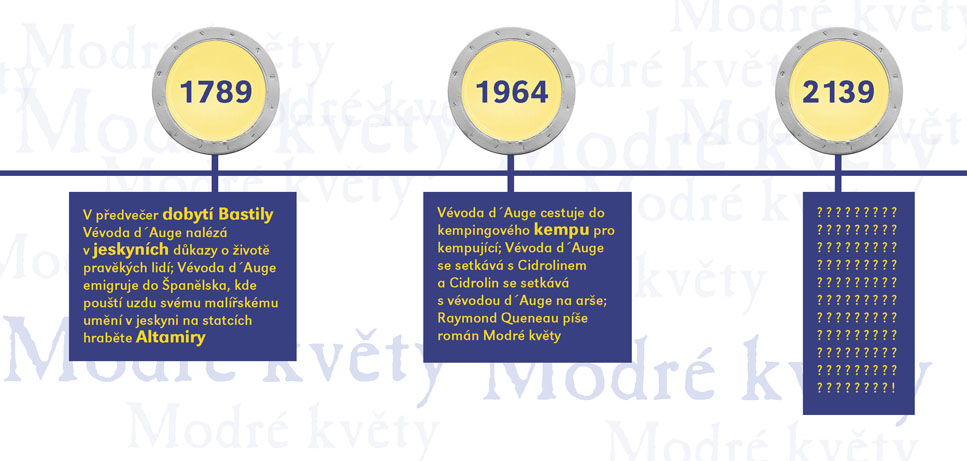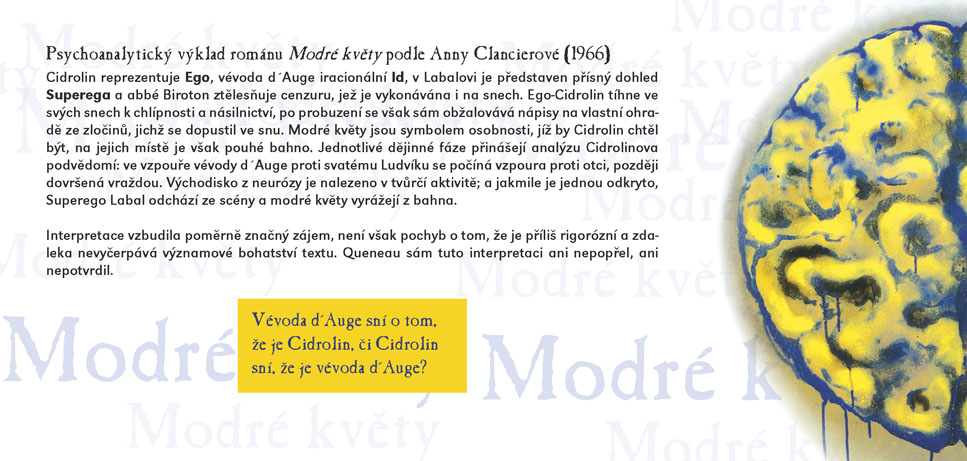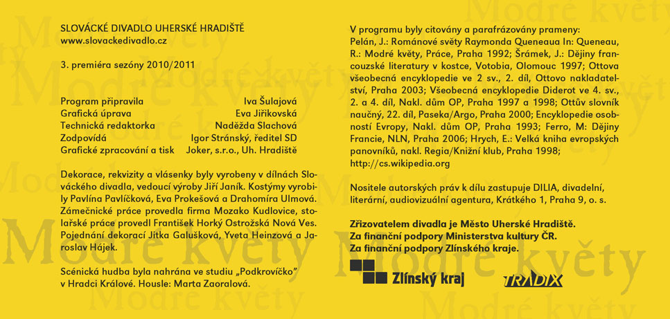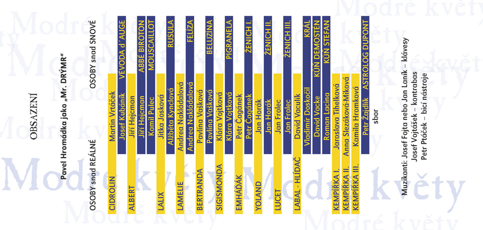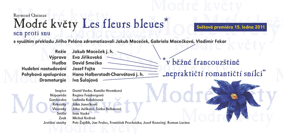 Čuang-c´ sní o tom, že je motýl, a po probuzení zapochybuje, není-li motýl, který právě sní o tom, že je Čuang-c´, praví stará čínská filozofická anekdota. V Modrých květech Raymonda Queneaua sní Cidrolin o tom, že je vévodou d´Auge a ve svém snu projde mnoha historickými obdobími v celkovém úhrnu sedmi set let. A nebo snad vévoda d´Auge sní uprostřed středověku o Cidrolinovi a daleké budoucí době, v níž místo koní jezdí kviklavé potvůrky na čtyřech kulatých tlapkách? A co teprve, jestli se Cidrolin s vévodou jednoho dne potkají? Queneauův román z roku 1965 zdramatizovali Jakub Maceček, Gabriela Macečková a Vladimír Fekar. Výrazně experimentátorský a hravý autorův vyprávěcí styl na jevišti rozvíjí osobitá režie hostujícího Jakuba Macečka (jehož inscenace Mein Faust a Villon F. (Na krk oprátku ti věší) jste mohli v předchozích sezónách ve SD vidět), umocněná výrazně stylizovanou výtvarnou složkou Evy Jiřikovské a dynamickou hudbou Davida Smečky, interpretovanou živě na jevišti. Úsměvnou, snivou i milostnou komedii, která si trochu tropí smích z pojímání lidských dějin, uvádí Slovácké divadlo ve světové premiéře.