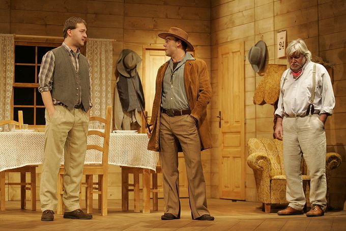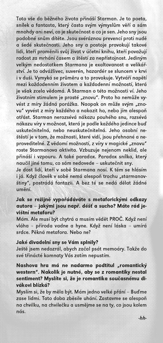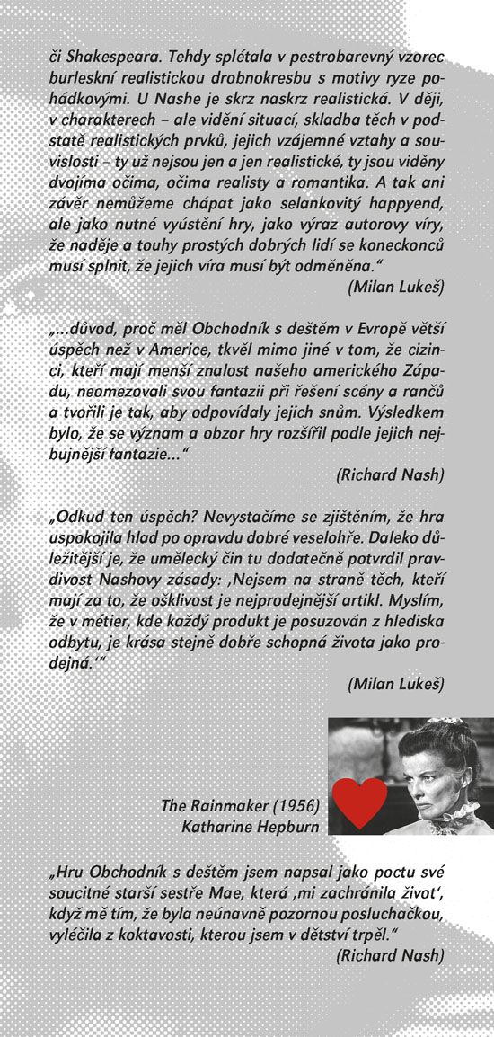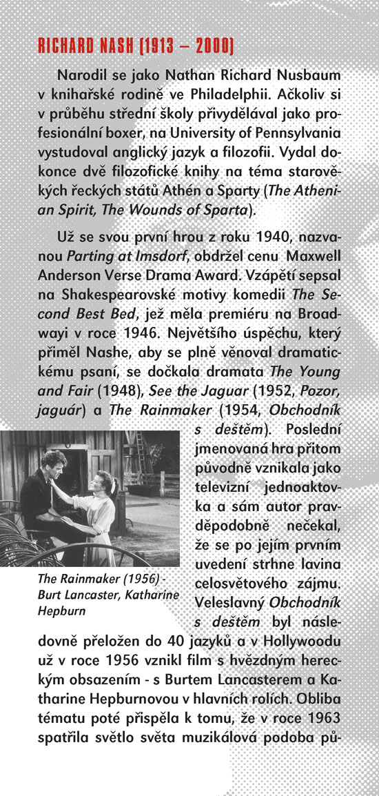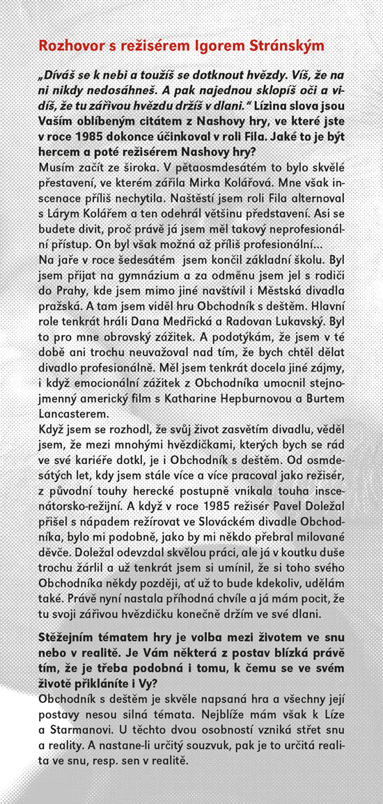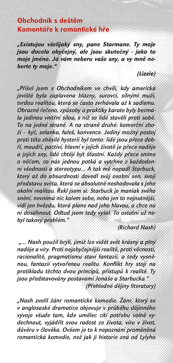Klasické americké drama z roku 1954 se odehrává v období sucha na farmě rodiny Curryových. Do prostředí rodiny, čítající otce a jeho potomky – Noema, Jima a Lizzie, jednoho dne přibude svérázný host, jenž svým až provokativně snílkovským pohledem na svět dokáže rodinu přimět ke konfrontacím, kterým se celý život vyhýbala. Říká si Bill Starman a považuje se za vyvolávače deště, o čemž úspěšně přesvědčuje zoufalé farmáře, kteří mu za „dešťový zázrak“ ochotně platí. Ačkoliv o této schopnosti většina rodiny pochybuje a pragmatický Noe ho už od prvního shledání považuje za podvodníka, svým idealistickým pohledem na život dokáže v lidech vzbuzovat sympatie. Jima povzbudí na cestě k dospělosti a v nevzhledné Lizzie se mu podaří probudit sebevědomí a lásku k sobě samé. Jak se mezi Curryovými nenadále objevil, tak nenadále zmizí. Zanechává po sobě spíše déšť emoční než přírodní, ale o to v romantické, humorné a dojemné hře Richarda Nashe jde především. Od posledního uvedení hry ve SD uplynulo čtyřiadvacet let, nyní ji máte možnost vidět v provedení režiséra Igora Stránského.