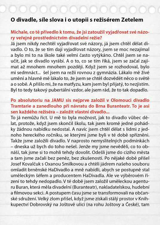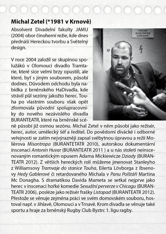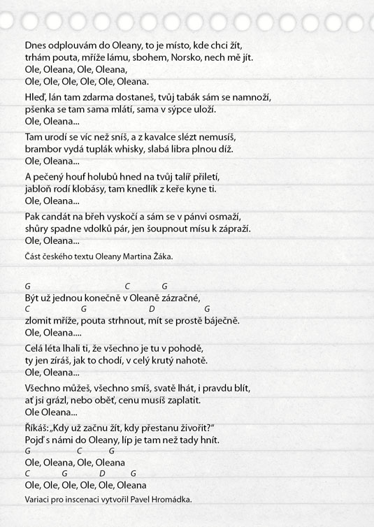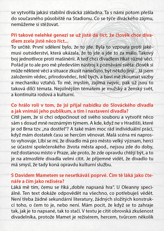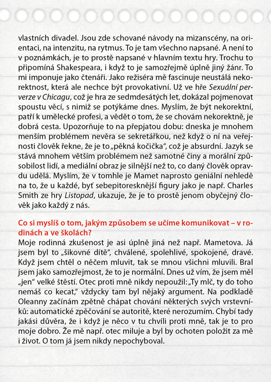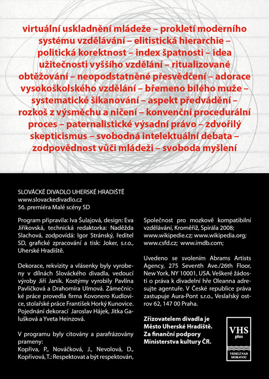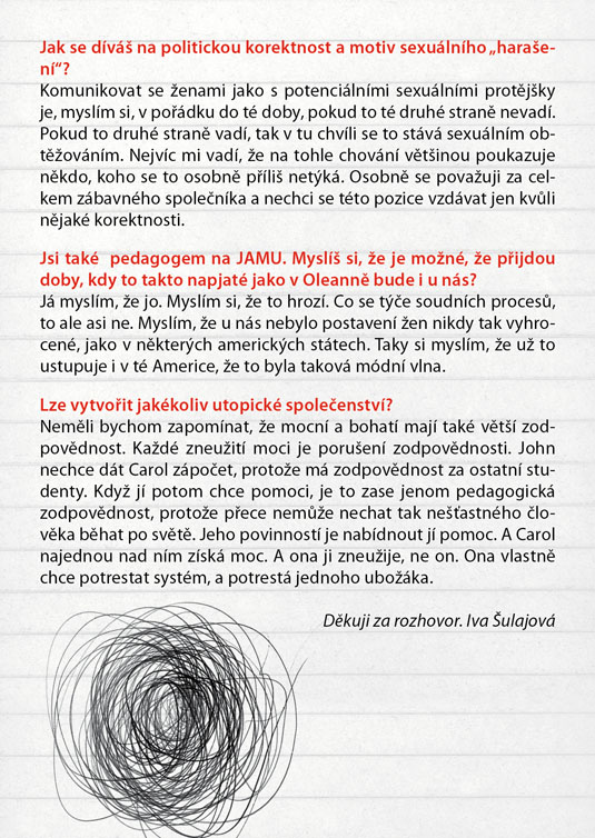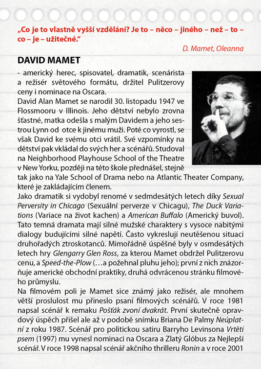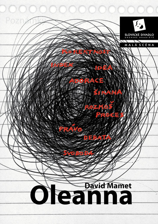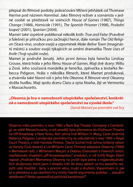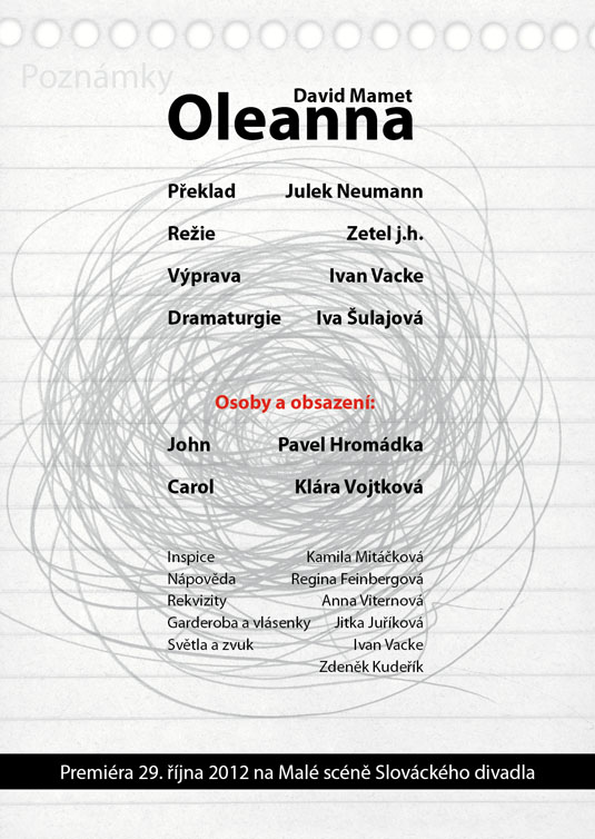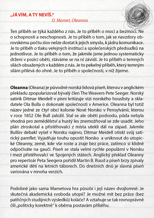 Američana Davida Mameta, autora světového formátu ověnčeného Pulitzerovou cenou i nominací na Oskara, zná širší veřejnost také jako filmového režiséra a scénáristu (scénář k filmu Vrtěti psem, Ronin, Hannibal). Jeho hra Oleanna, kterou sám rovněž v roce 1994 natočil i jako filmový snímek, je brilantně napsaným psychologickým dialogem, který tematizuje na jedné straně formálnost a institucionálnost současného života moderní společnosti (často nám jde spíš o hledání nejrůznějších forem a skutečný obsah komunikace člověka s člověkem nám uniká), na druhé straně zneužívání moci v různých podobách. Hlavními aktéry příběhu jsou neúspěšná studentka, usilující o opravu svých studijních výsledků, a úspěšný profesor, jemuž právě oznámili povýšení. Tradiční a od základu nerovné postavení učitele a žáka je zde ještě „zproblematizováno“ prvkem mužsko-ženského napětí. Nejde zdaleka jen o míru domnělé či skutečné náklonnosti, na jejímž konci může stát až obvinění ze sexuálního obtěžování – ale především o naprostou neschopnost dorozumět se. Právě jazyk se stává účinnou zbraní v „zápase“, v jehož průběhu se několikrát změní pozice „útočníka“ a „obránce“, ale který za sebou nemůže zanechat vítěze, nýbrž pouze poražené. Název Oleanna pak ironicky odkazuje k populární americké písni o utopické zemi, „kde pečení holubi lítají do huby“. Další skvělá možnost sledovat divadlo z „nebezpečně blízkého“ úhlu, kde budete mít herce takřka nadosah, tentokrát v režii hostujícího Michala Zetela.