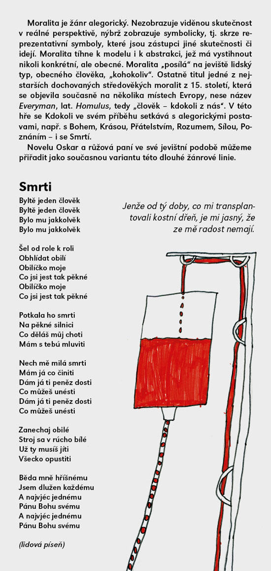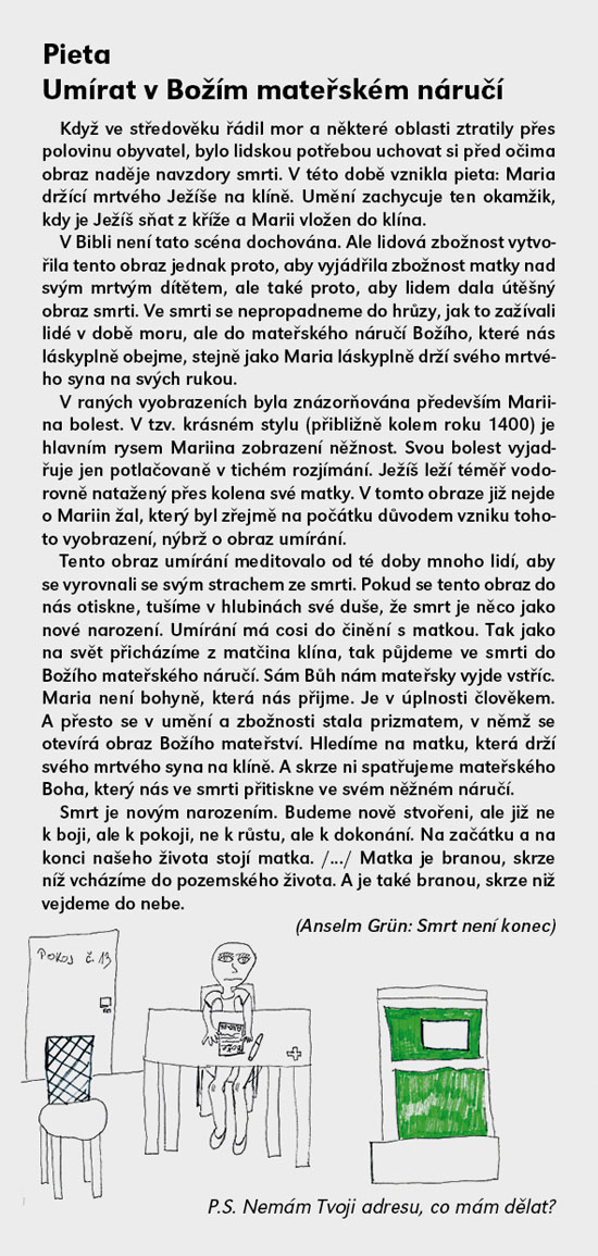Naučili jsme se smrt v posledních desetiletích nepouštět do našich životů. Odháníme ji jak žebračku od našich prahů a přitom si tím jen lžeme do vlastní kapsy a nedochází nám, jak pošetile se chováme. Zvykli jsme si umírat v izolaci, někde mimo zraky všech, ve sterilním prostředí nemocnic a léčeben pro dlouhodobě nemocné. Až příliš často také v osamění, v úzkosti a strachu, sice pod pláštěm chemických utěšitelek, vlídných snad k našemu chátrajícímu tělu, leč netečných k naší rozbolavělé duši. Kéž bychom přitom potkali – dříve než smrt – i tu „růžovou paní“!