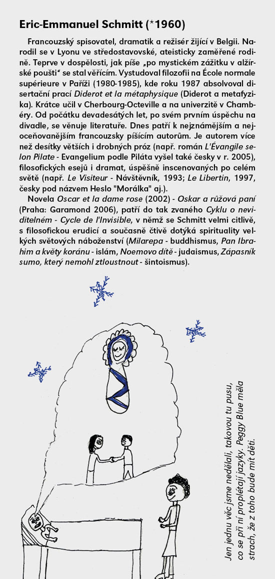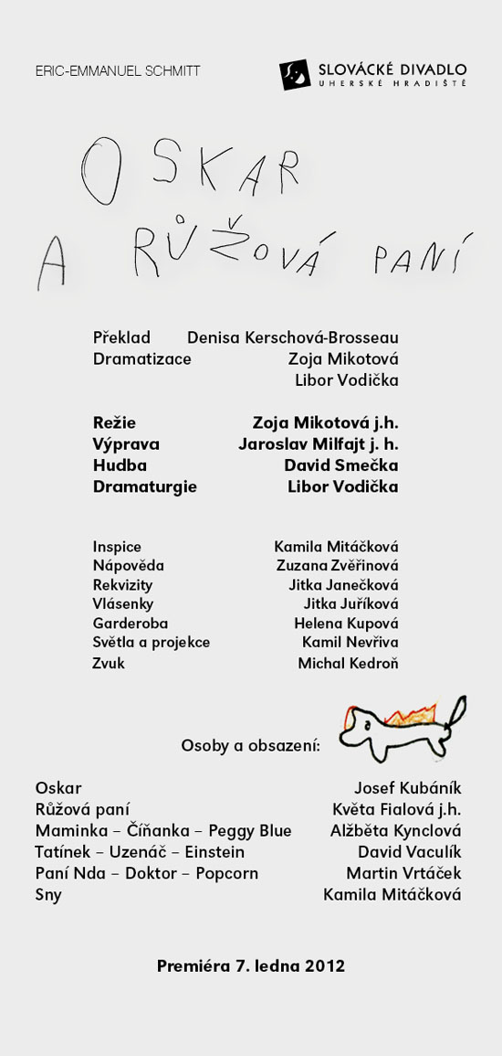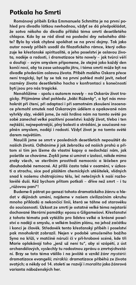 Románový příběh Erika Emmanuela Schmitta je na první pohled pro divadlo látkou nevhodnou, vždyť se dá předpokládat, že sotva někoho do divadla přiláká téma smrti desetiletého chlapce. Kdo by se rád díval na poslední dny nebohého dítěte? Bylo by však chybné spoléhat se na první dojmy. Tak jako autor novely příběh usadil do filozofického rámce, který odkazuje ke křesťanské spiritualitě, a jeho poselství je oslavou života, naděje a radosti, i dramatizace této novely – jak tvůrci věří a doufají – svým smyslem připomene, že stejně jako každý den končí nocí, aby ta zase ustoupila jitru, i téma smrti může být na divadle především oslavou života. Příběh malého Oskara přece není tragický, byť by se tak na první pohled mohl jevit, neboť rozměry života desetiletého hocha v konfrontaci s konečností bytí jsou pro nás tragické.