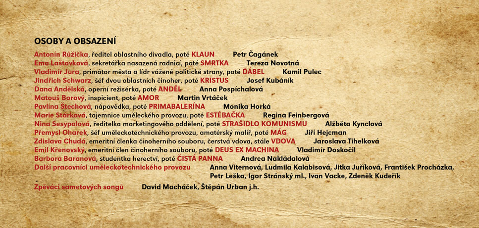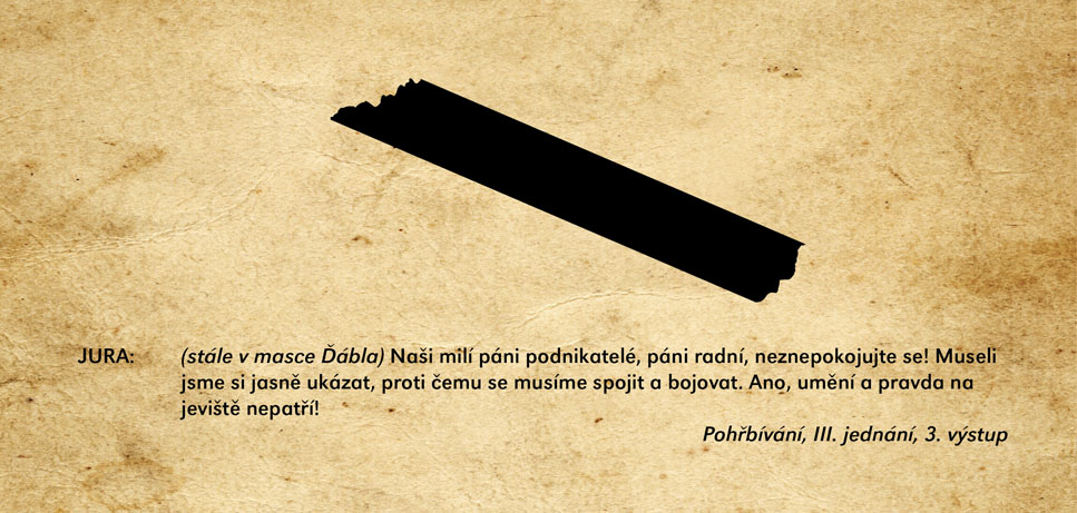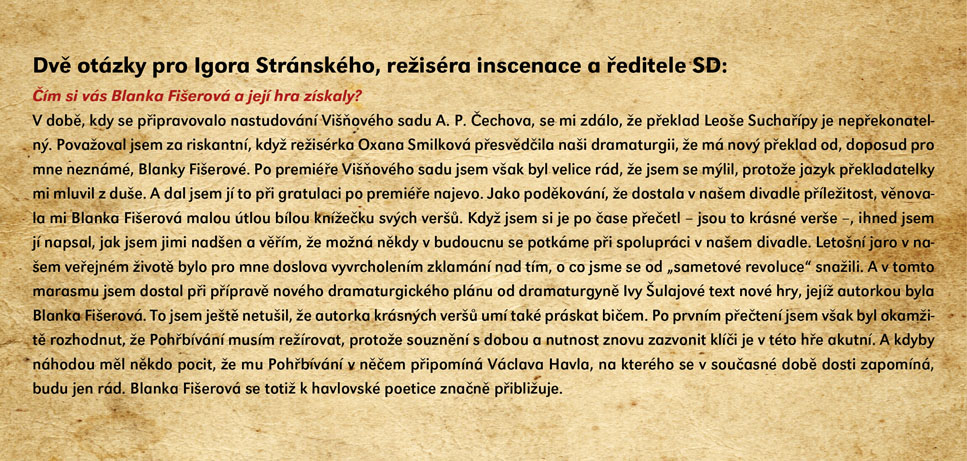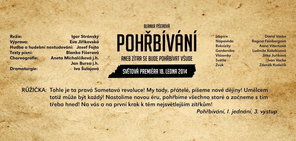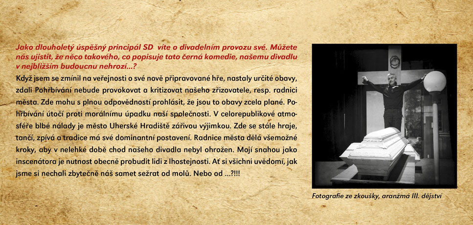 Velmi černá komedie o jednom oblastním divadle, kde se finanční krizi a krizi v kultuře rozhodnou vyřešit jednoduše – lze přece hrát divadlo i bez herců. Nejsou už v divadle potřební, jejich místa zaujmou zbylí zaměstnanci divadla a úředníci magistrátu. Co bude takto vytvořený „soubor“ hrát? Primátor města sepíše hru „Pohřbívání" (chce tak využít divadlo pro svou předvolební kampaň) a nový podnikatelský záměr „Zinscenujeme váš pohřeb přímo na našem jevišti“ dostává zelenou. Nápověda, inspicient, pokladní, účetní – ti všichni se do studování svých úloh pustí s veškerou vehemencí. Důležitou roli zde hraje také mrtvý bezvýznamný herec, který má být na výslovnou žádost jeho manželky (taktéž herečky) jako první pohřben přímo na jevišti. Zkoušení může začít! A může se zdát, že v zemi ulpívajícího socialismu s kapitalistickou tváří se možná… zítra bude pohřbívat všude! Groteska nejen o stavu kultury v Čechách nabízí potenciál skvělých hereckých příležitostí v rolích „ne-herců“ a v režii Igora Stránského bude ve Slováckém divadle uvedena ve světové premiéře.
