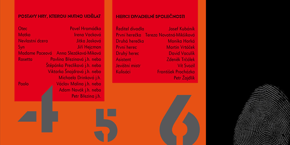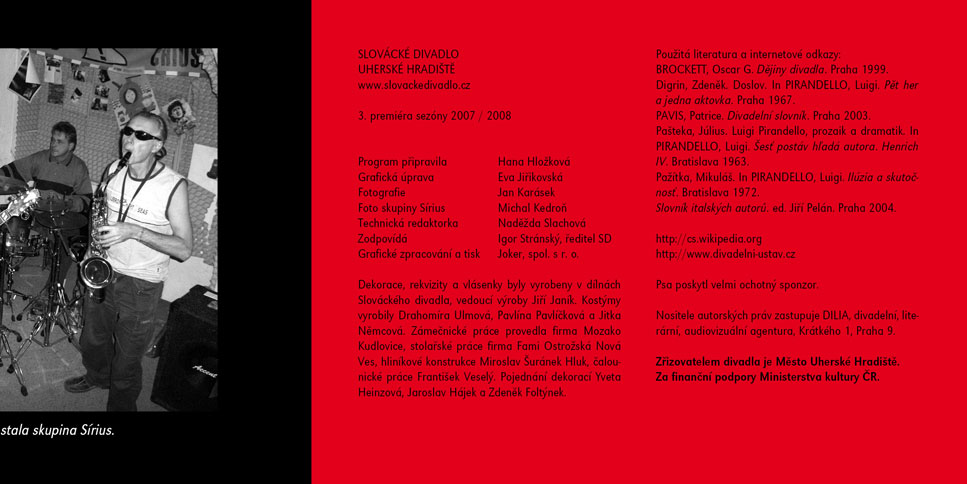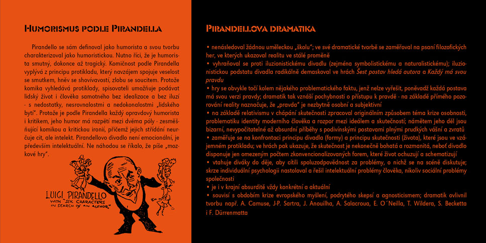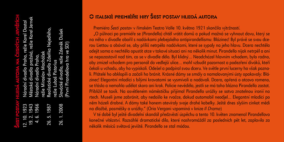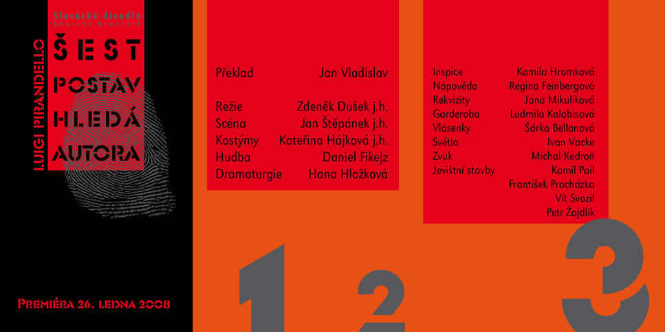 „Nejlepší hry Luigiho Pirandella jsou ty, ve kterých je mírný naturalistický úvod preludiem k divokému otřesu, když je vystaven pochybnostem divákův racionální svět." Sicilský rodák, dramatik, prozaik a básník, nositel Nobelovy ceny za literaturu za rok 1934, vstupuje na prkna SD vůbec poprvé a to proslulým dramatem Šest postav hledá autora. Hra se odehrává na jevišti jednoho divadla, kde právě probíhá běžná divadelní zkouška, která je však přerušena příchodem šesti záhadných lidí. Představí se jako postavy, které hledají autora, jenž by jejich osobní dramata převedl do jevištní podoby. S důvěrou se obracejí na ředitele divadla a ten si společně s herci vyslechne jejich příběhy a svolí k tomu, aby se zúčastnili zkoušky. Postavy však začnou zasahovat do hry herců, která se jim nezdá pravdivá a přesvědčivá, tudíž dané scény ze svých tragických osudů začnou hrát sami. Jak tato zkouška dopadne? Pirandello se v této hře snažil „setřít hranici mezi scénickou fikcí a skutečností, zpochybnit jistoty skutečného světa a vtáhnout diváky do děje, aby cítili spoluzodpovědnost za problémy, o nichž se na scéně diskutuje". Legendární drama bude ve SD studovat Zdeněk Dušek, jenž je v poslední době režijně „podepsán" pod Skleněným zvěřincem a Svačinkou generálů.