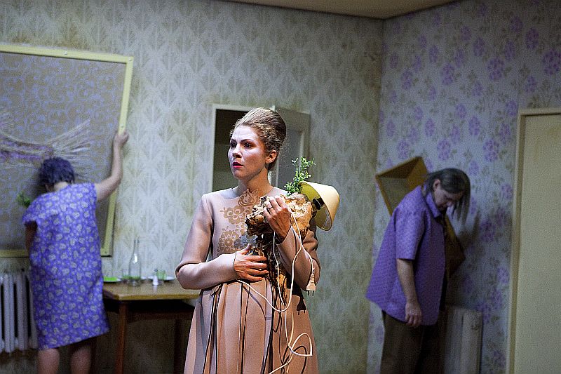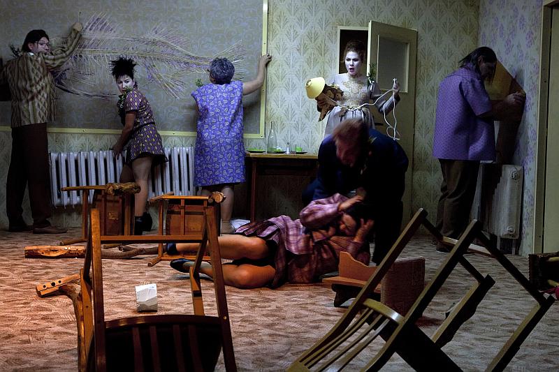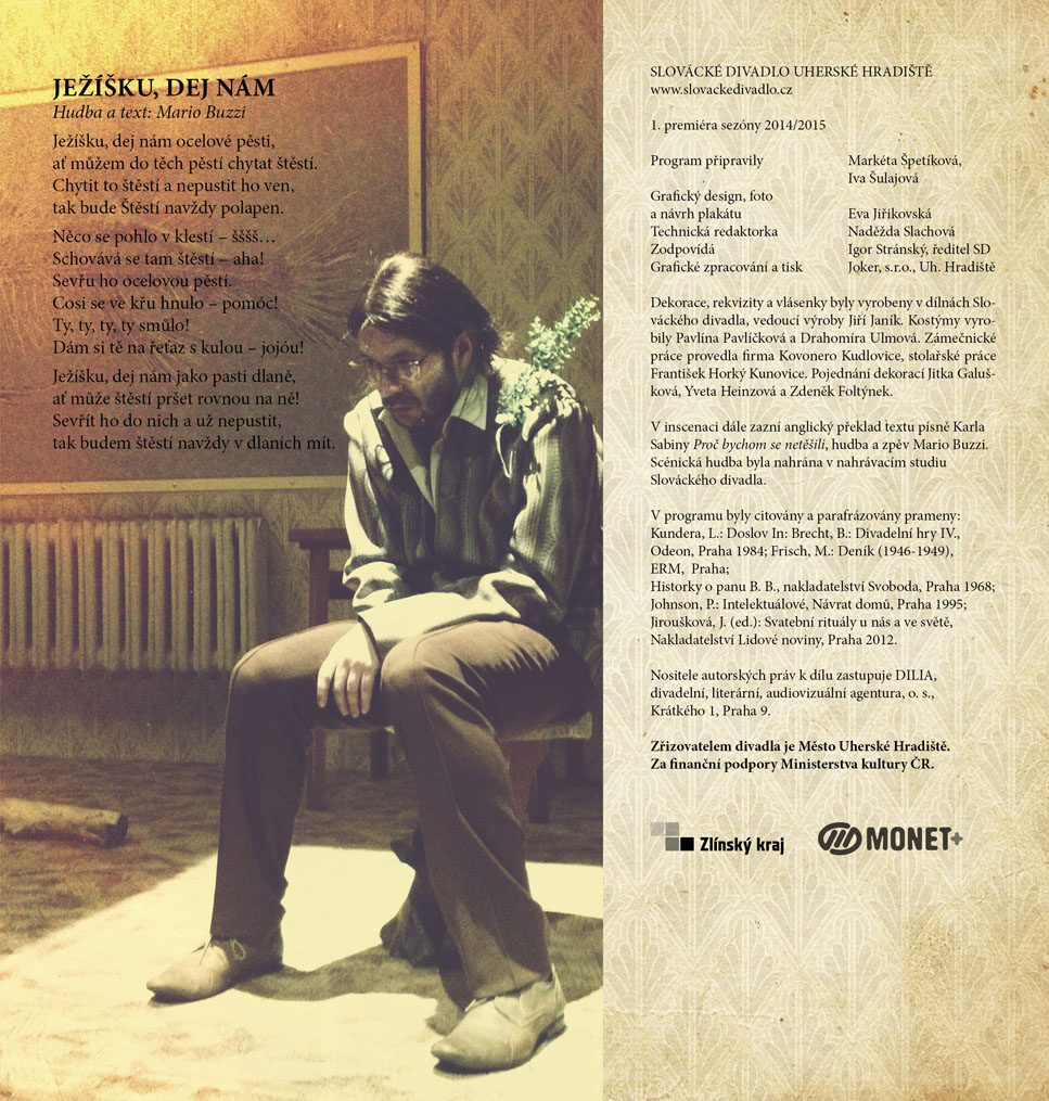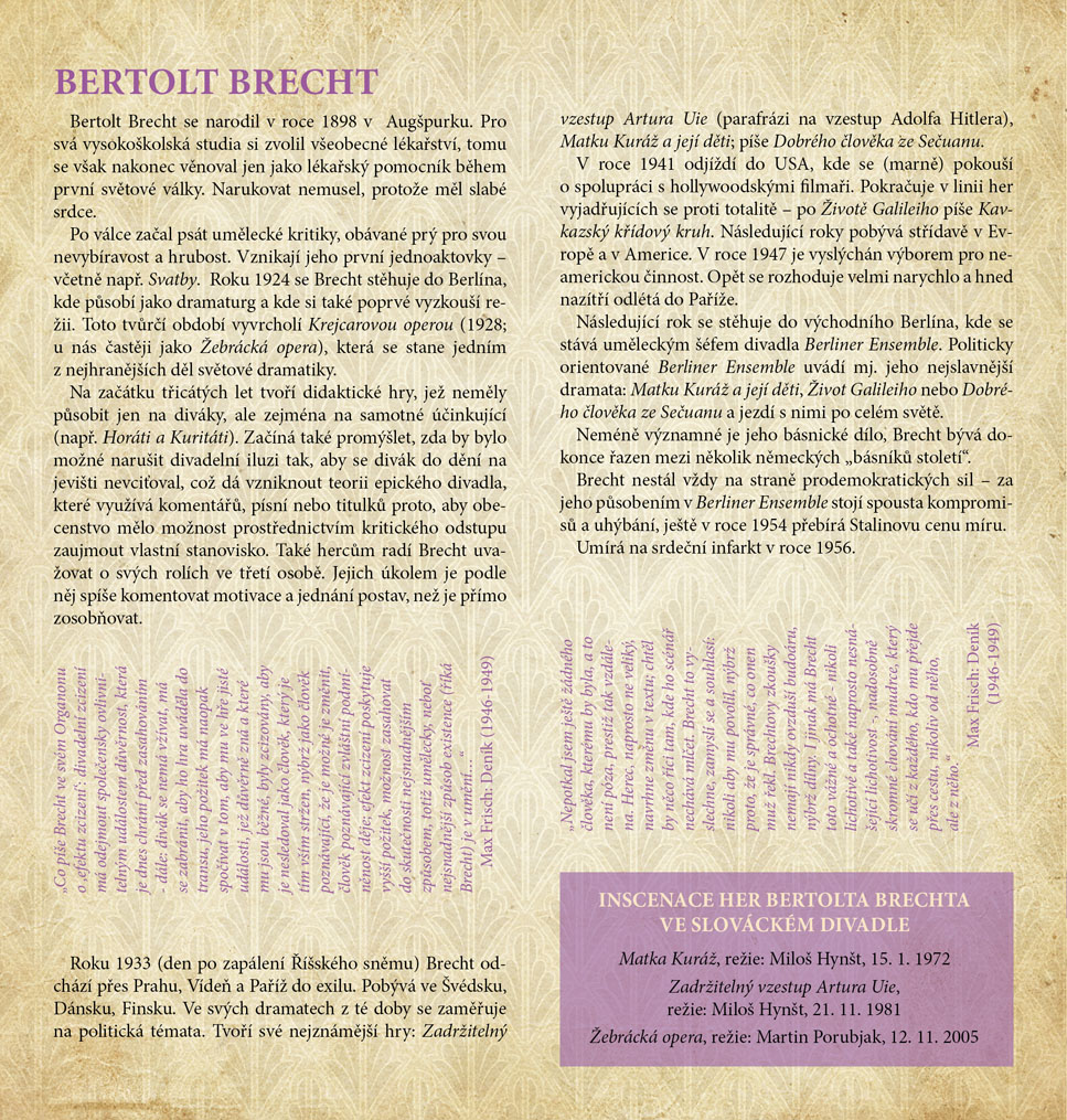 Na rozdíl od Brechtových vrcholných her, mezi něž patří např. Žebrácká opera, se kterou jsme se na jevišti Slováckého divadla setkali téměř před desíti lety v režii Martina Porubjaka, Svatba (1919) je raná krátká hříčka, kterou Brecht napsal ve svých jednadvaceti letech jako součást souboru pěti aktovek „jen tak pro osvěžení“. A skutečně vykazuje neobyčejnou lehkost stylu, postavy až formanovského ražení (jak bychom dnes řekli) a přitom rytmus grotesky, jenž bývá často nazýván bránou do absurdního divadla. Ale je to tak trochu i „jako z Čechova“: kdo miluje B, když A miluje C, C miluje D a D miluje A? Kdo a proč a komu co vlastně doopravdy sděluje, když mluví? Hořce komický pohled na obecně mezilidské vztahy, zvláště pak na ty rodinné, jež metaforicky zobrazuje rozpadající se nábytek a klih, který neklíží. Devět herců neopustí po celou inscenaci scénu a rozpoutané emoce svatebního „veselí“ se budou podobat jízdě na horské dráze. Půvabná aktovka má v českém divadelnictví bohatou inscenační tradici, mezi nejznámější patří např. Svatba někdejšího Divadla na provázku v režii Petera Scherhaufera (1978). Naši diváci ji mohou vidět v nastudování režisérky Anny Petrželkové.