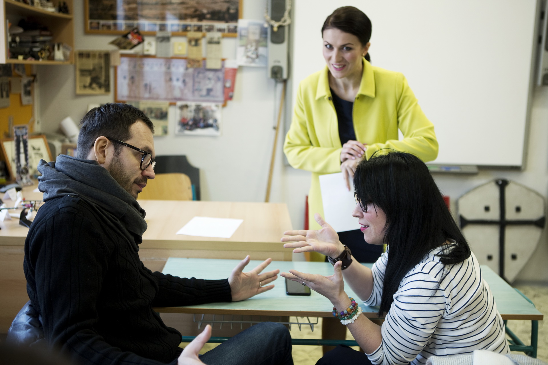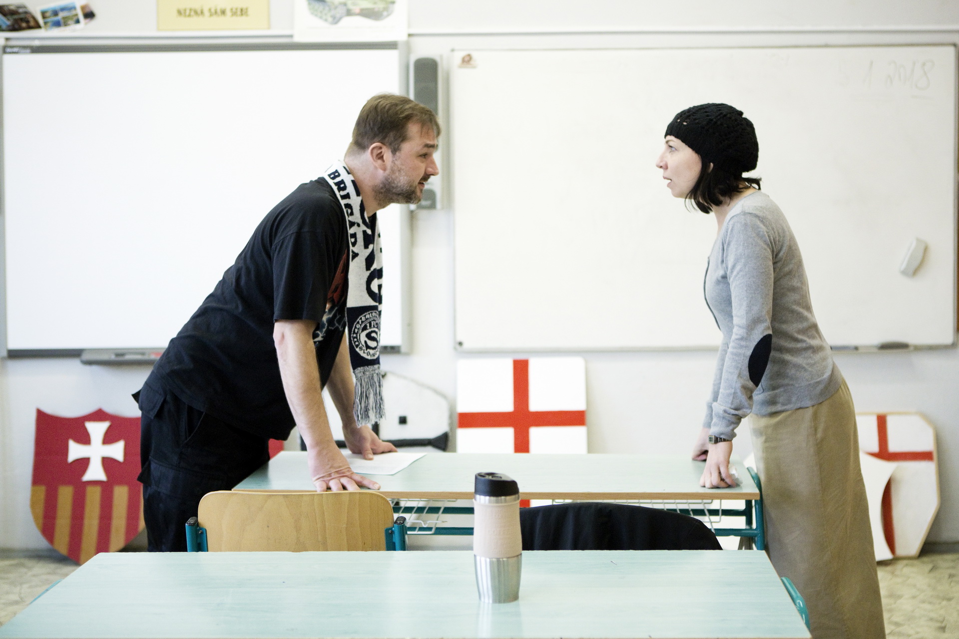 Překlad Michala Kotrouše se osvědčil i na jihovýchodě Moravy, umístění inscenace do školní třídy už méně. Není nic složitého posadit žáky nebo v případě Úči jejich rodiče do lavic na jevišti. Alternativnost se ale tentokrát Moravským Slovákům podařila jen tak napůl. K většině diváků sedí aktéři zády, takže plně vychutnat si mohou jen učitelku Sabinu Milerovou Ireny Vackové. Rodičovský sbor jen pokud stojí u tabule a prohledává tašku nešťastné pedagožky.